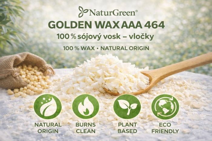 Golden Wax AAA 464 od NaturGreen® je prémiový 100 % sójový vosk, vyrobený z hydrogenovaného sójového oleje a sójových monoglyceridů s čistotou vyšší než 99 %. Vosk je bez parafínu, palmového oleje a syntetických příměsí a představuje moderní alternativu ke klasickým parafínovým voskům.